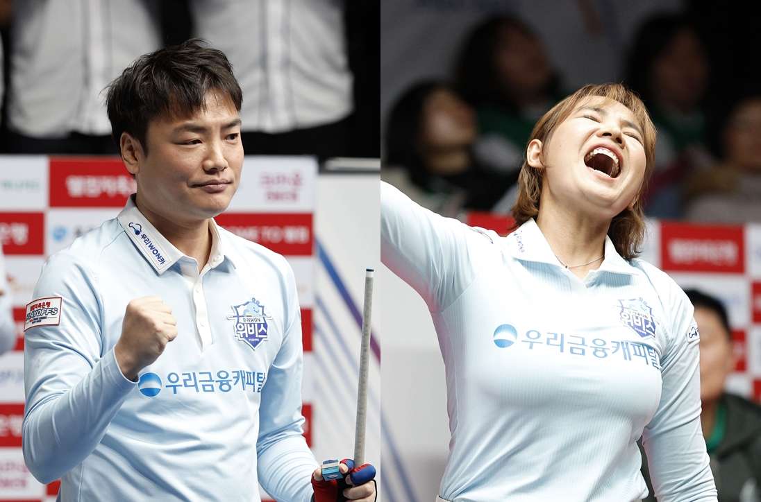 우리금융캐피탈 우리WON위비스가 22일 펼쳐진 '웰컴저축은행 PBA팀리그 2024-25' 포스트시즌 플레이오프 1차전서 하나카드 하나페이를 세트스코어 4:1로 제압 먼저 1승을 챙겼다. 이날 경기에서강민구는 2승, 스롱피아비는 '여제' 감가영과의 맞대결을 이기며 팀 승리에 공헌했다.