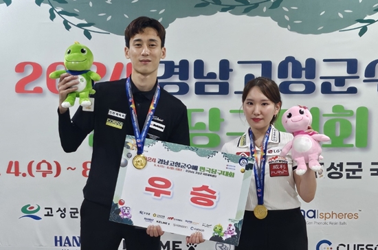 권호준-이하린 팀은 4일 오후 경남 고성군 국민체육센터서 열린 ‘2024 경남고성군수배 전국당구대회’(고성군수배) 전문선수부 포켓복식전 결승서 한소예-김범서(충남) 팀을 세트스코어 9:4로 누르고 우승을 차지했다.