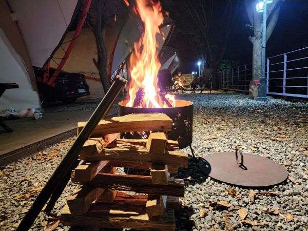 글렘핑 출입구 앞에는 계곡을 바라보며 불멍과 사색을 즐길 수 있는 안락의자 및 탁자, 그리고 캠핑에서는 빠질 수 없는 바비큐 시설이 완벽하게 갖춰져 있었다. 혼자 훌쩍 떠나서 며칠이고 묵어도 전혀 불편함이 없겠다는 생각이 들었다.