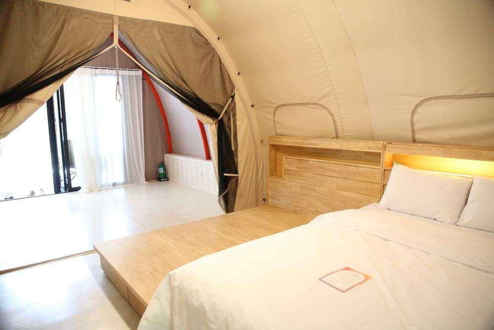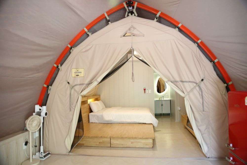 글렘핑 내부에 별도로 설계된 침실에는 심플한 침대와 정갈하고 고급스러운 침구가 정리되어 있었고, 화장실과 세면실은 최신식으로 갖춰져 있었다. 여러 명이 묵을 수 있도록 추가로 침구세트가 준비되어 있었고, 거실같은 글렘핑장 내부에는 냉장고 에어컨 커피포트 밥솥 등등 생활용품과 주방용품이 완벽하게 갖춰져 있었다.