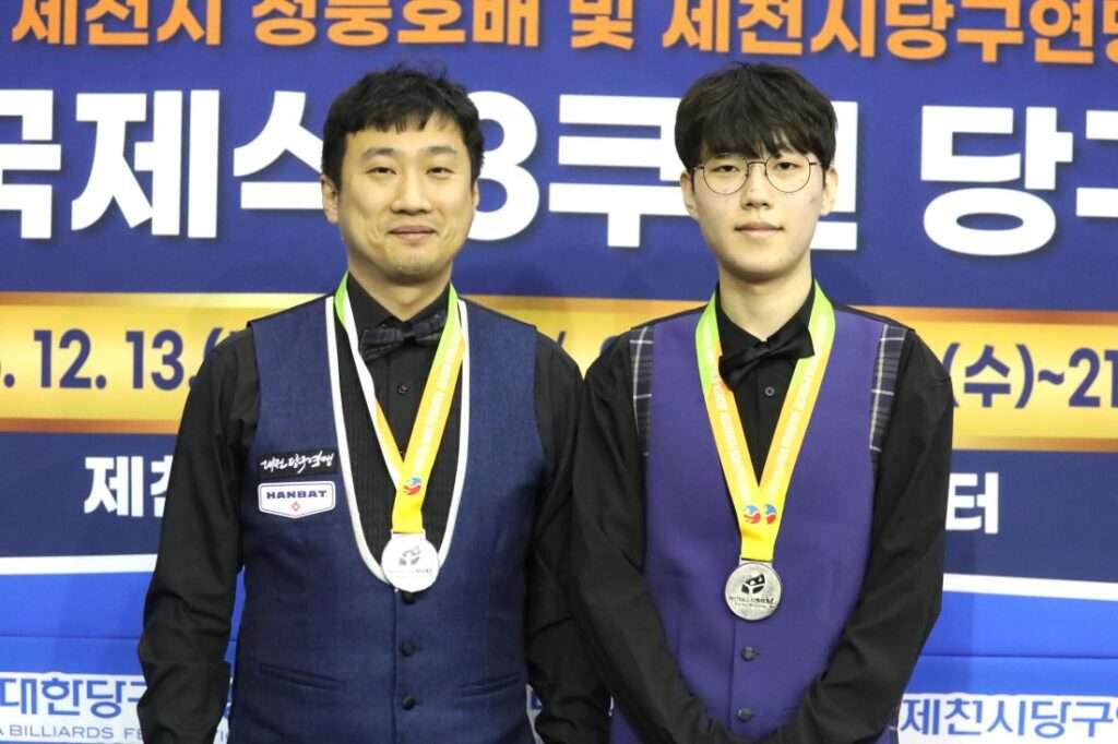 대전당구의 미래 정민교가 ‘제1회 제천 청풍호배 전국3쿠션당구대회’ 복식전에서 스승인 홍진표(대전)와 합을 맞춰 준우승에 올랐다.