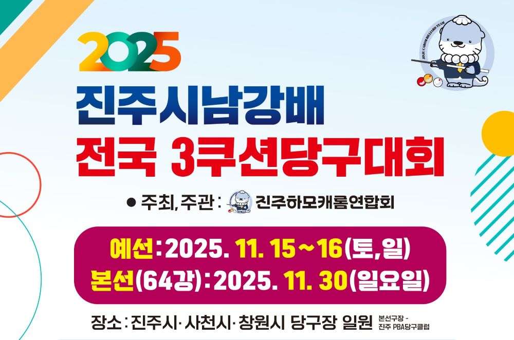 ‘2025 진주시남강배 전국3쿠션당구대회’는 지난해에 이어 두 번째로 열리는데, 시상금 규모가 거의 두배로 커졌다. 총상금이 무려 3,480만원 규모이다.