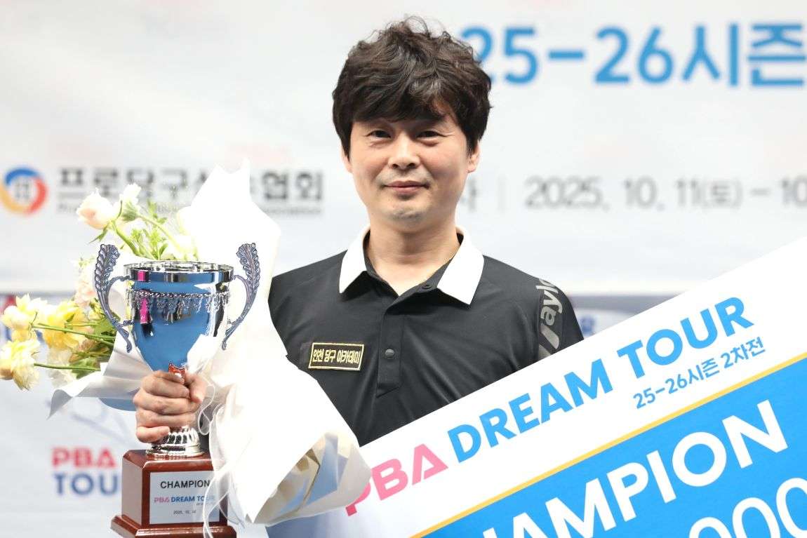 김태융이 14일 열린 ‘2025-2026 PBA ’드림투어 2차전‘ 결승전에서 최경준을 풀세트까지 끌고가는 진땀승부 끝에 3:2로 제압하며 ‘2022-2023 고리나 PBA 드림투어 3차전’ 우승 이후 약 3년만에 통산 두 번째 우승을 달성했다,