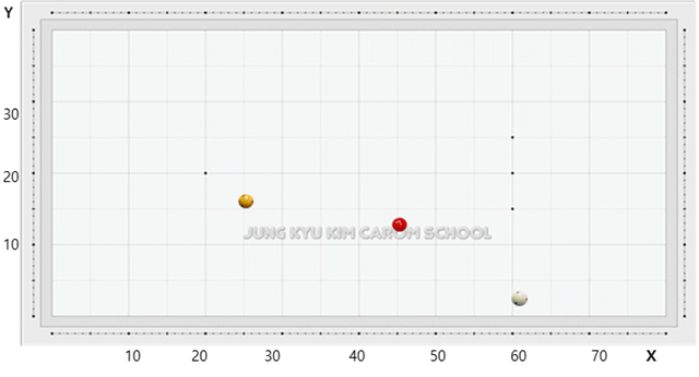 수구가 흰 공이며 위치는 X61 Y02에 위치하여 있고, 1적구로 선택하는 황색공은 X25 Y16에 배치되어 있으며, 2적구인 적색공은 X46 Y13의 자리에 배열되어 있습니다.
