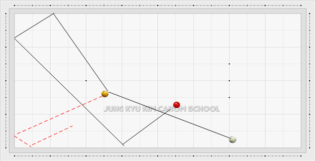 위와 같이 공략을 하려고 할 때 가장 조심하여야 할 요인은 수구의 진행을 과감하지 못하고 조심스러운 느낌으로 활동성을 억제하게 되는 경우 큐를 조심스럽게 움직이게 되는 현상이 가장 큰 실패요인이 될 것입니다.