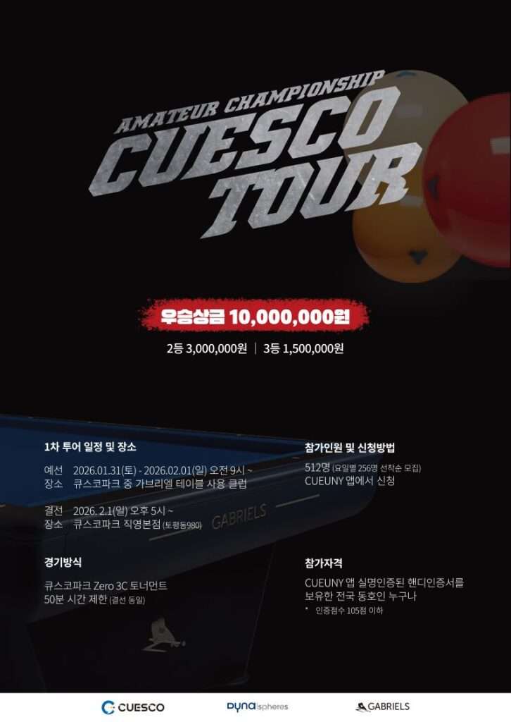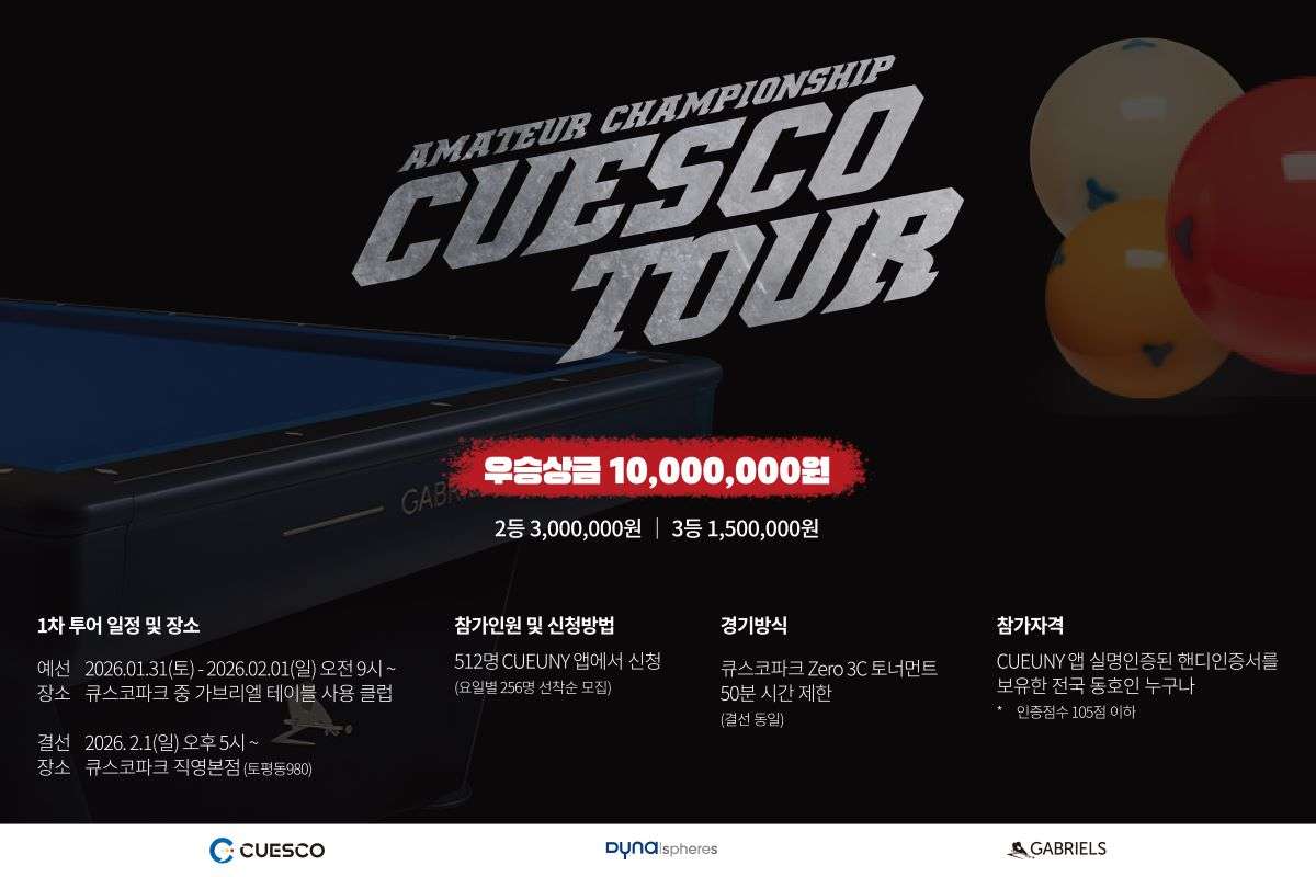 큐스코는 투어형 당구대회로 설계됐으며 가브리엘테이블과 다이나스피어스 공이 사용된다고 밝혔다.