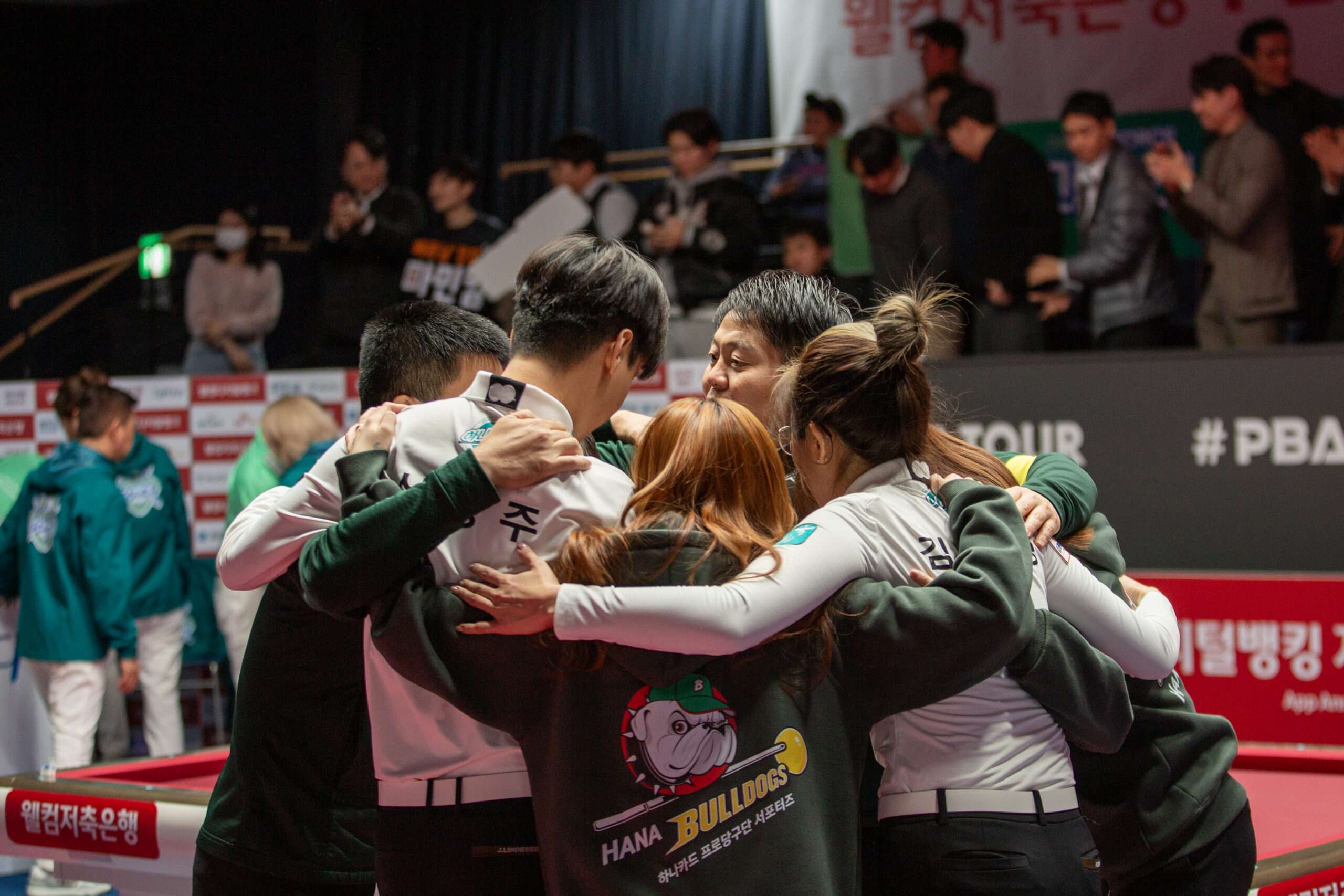 하나카드가 23일 오후 경기도 고양시 킨텍스 PBA전용구장서 펼쳐진 23/24 ‘웰컴저축은행 PBA팀리그 포스트시즌’ 플레이오프(PO)A 4차전서 ‘시즌 최종1위’ NH농협카드 그린포스를 세트스코어 4:1로 꺾고, 포스트시즌 파이널행을 확정지었다.