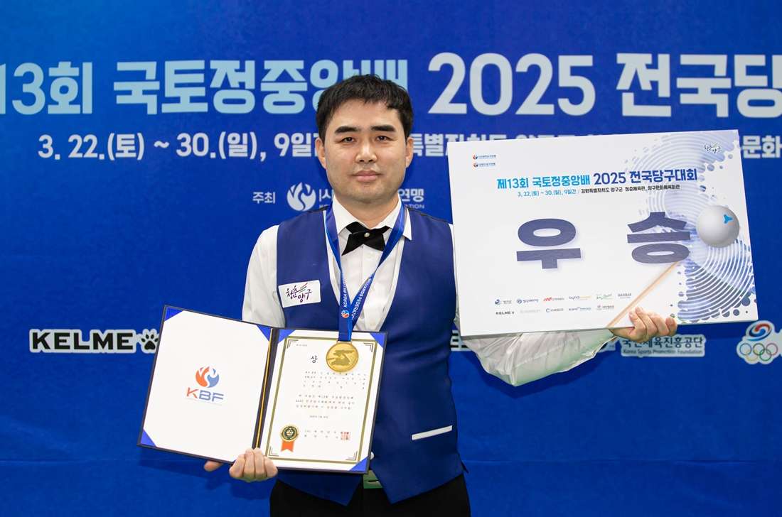 황철호(전북/국내2위)는 26일 오후 강원특별자치도 양구군 양구문화체육회관서 펼쳐진 ‘제13회 국토정중앙배 2025 전국당구대회’(국토정중앙배) 잉빌 일반부 개인전 결승서 ‘랭킹1위’ 이대규(인천광역시체육회)를 프레임스코어 2:0(101:98, 101:74)로 꺾고, 우승을 차지했다.