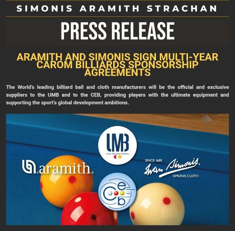 아라미스와 시모니스, UMB & CEB와 2029년까지 4년간 공식 당구용품 공급 계약