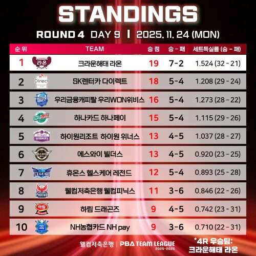 마르티네스: 4라운드 우승을 할 수 있어 굉장히 기쁘다. 선수들이 열심히 해준 만큼 고맙고 자랑스럽다. 3라운드에 전패를 할 때 정말 힘들었다. 순위가 뒤쳐지면서 힘든 시간을 보냈는데, 굉장히 좋은 결과로 4라운드 우승해 기쁘다. 또 이번 라운드에 역전승이 많았다. 팀원들이 고맙고 자랑스럽다. 아울러 스폰서인 크라운해태홀딩스에게 감사하다는 말을 꼭 전하고 싶다.