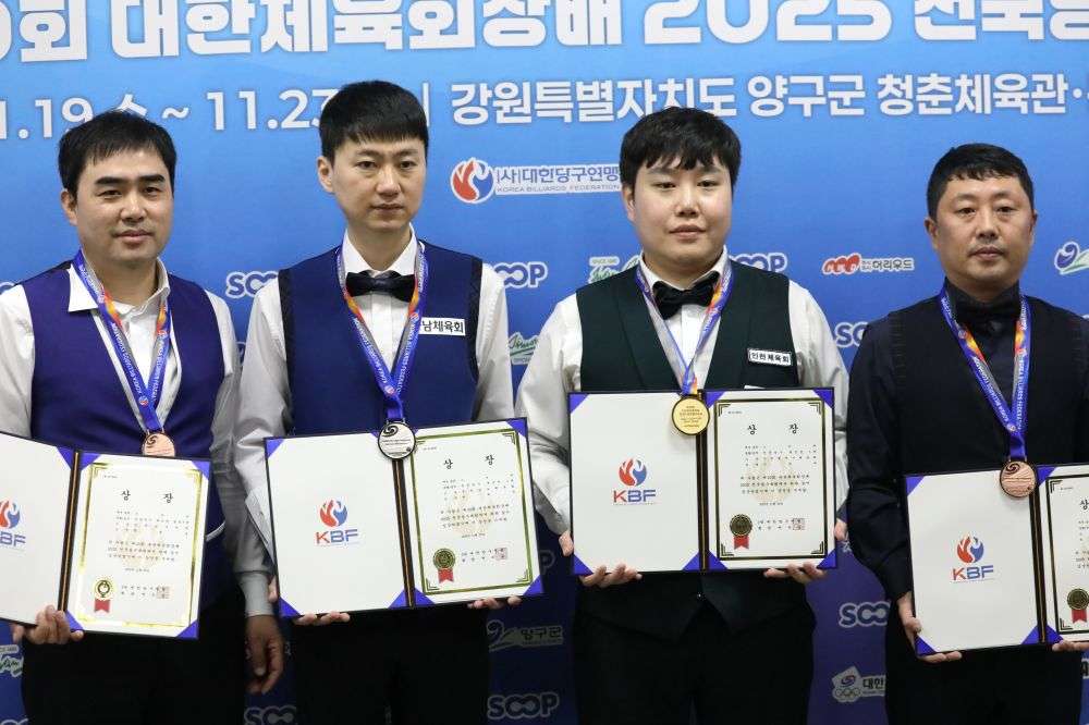 제20회 대한체육회장배 스누커 입상자들. 왼쪽부터 공동3위 황철호, 준우승 허세양, 우승 이대규, 공동3위 최경림.