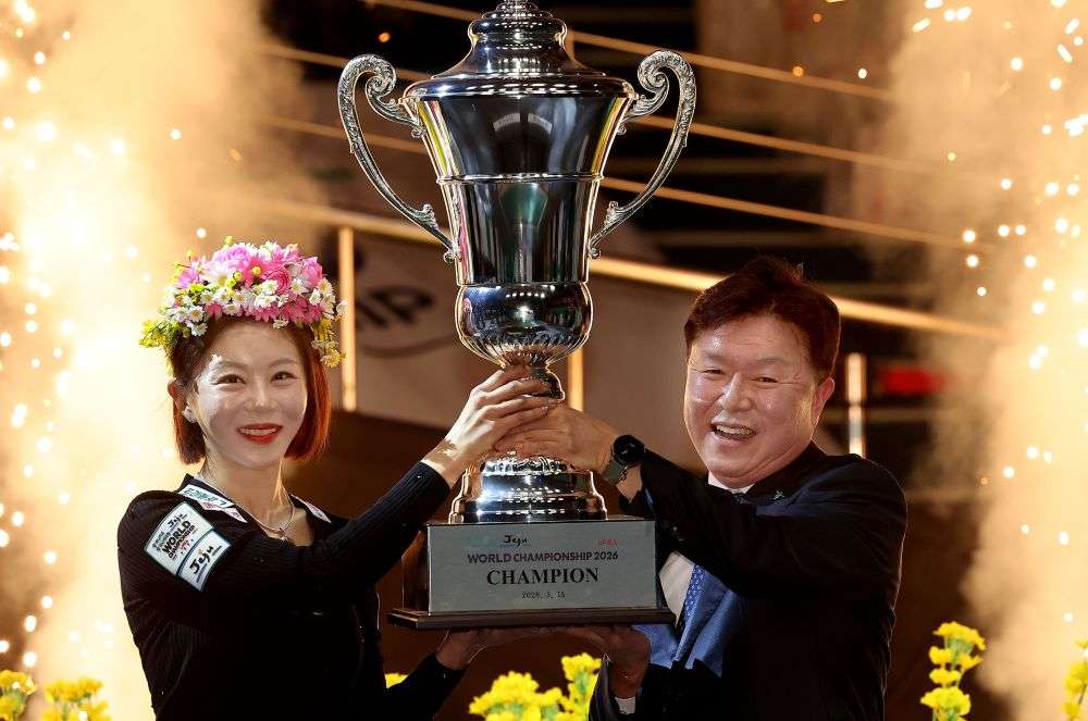 15일 제주특별자치도 한라체육관 특설경기장에서 끝난 ‘하나카드-하나캐피탈 LPBA 월드챔피언십 2026’ 결승전서 김가영은 한지은의 겁없는 도전에 초반 멈칫했으나 이내 ‘당구여제’의 저력을 마음껏 과시하며 세트스코어 4:1로 승리했다.