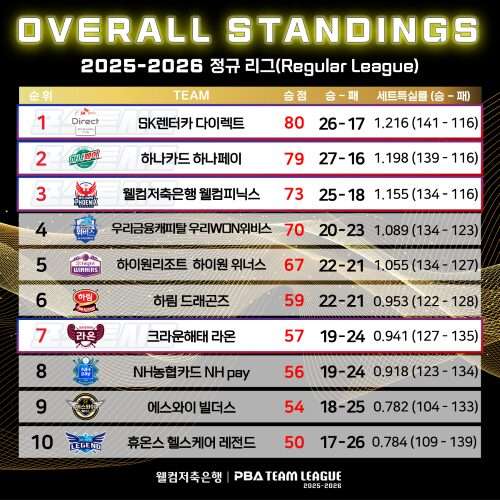 두 팀 모두 승점을 확보하지 못하면서 SK렌터카(26승17패·승점 80)가 선두를 지켰고, 하나카드가 1점 뒤진 2위(27승16패·승점 79)에 위치했다.