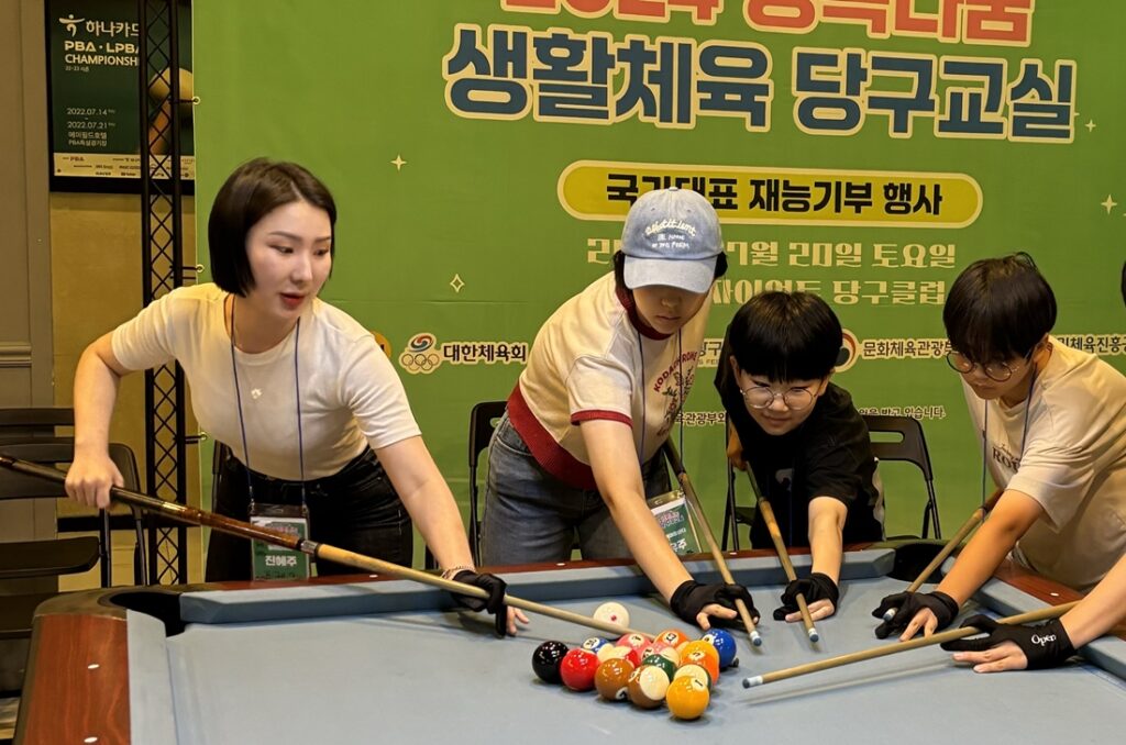 국가대표 당구선수들이 청소년 대상 일일 당구강사로 나섰다. 대한당구연맹은 지난 19일 경기 일산 자이언트당구클럽에서 청소년 대상 일일 재능기부 프로그램인 ‘스타 선수에게 배우는 당구교실’을 개최했다. 이날 박정현 허채원 캐롬선수, 고태영 진혜주 김보건 김수웅 포켓볼선수가 서울 금천교육복지센터, 고양 쉴가아동지역센터, 부천 행복플러스복지원 등 청소년 25명을 지도했다. 일일강사로 나선 선수들은 청소년 수강생들이 질문하면 자신들의 경험을 […]