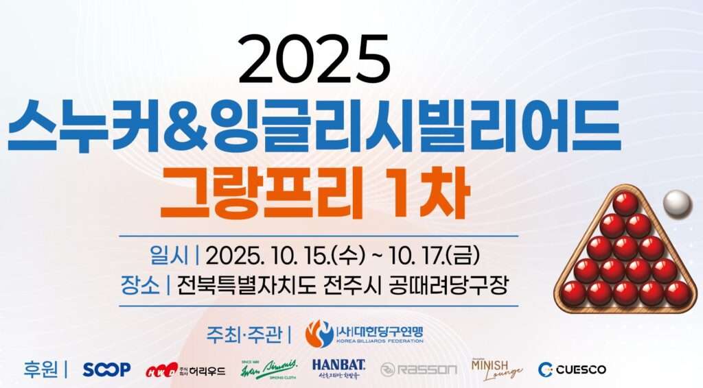 국내 스누커 및 잉글리시빌리아드 전용 대회가 전북 전주에서 2회 연이어 개최된다. 대한당구연맹은 10월 15일부터 17일(2025 스누커 & 잉글리시빌리어드 그랑프리 1차 대회)에 이어 20일부터 22일까지( ″2차 대회)를 전북 전주시 공때려당구장에서 개최한다고 15일 밝혔다. 대한당구연맹에 따르면 이번 대회는 스누커 및 잉글리시빌리아드 두 종목의 저변 확대와 전문체육 선수들의 경기력 향상을 목표로 마련됐다. 이번 대회에는 ‘제106회 전국체육대회’에서 스누커 […]