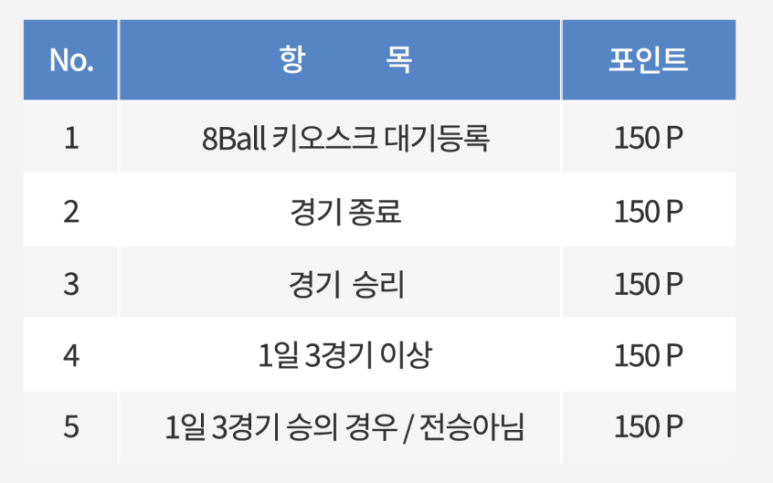 시범서비스 구장을 방문해 출석체크(대기등록)만 해도 8볼 포인트를 획득할 수 있고 경기후, 승리후에도 포인트를 획득할 수있다.