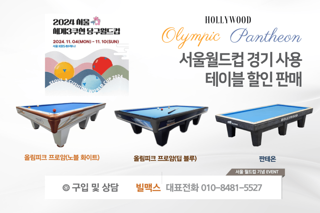 서울3쿠션월드컵 대회에 사용된 테이블이 할인 판매된다. 11월 4일(월)부터 10일(일)까지 강서구 KBS아레나에서 개최되는 서울3쿠션월드컵 공식테이블로 사용되는 ‘허리우드 올림피크와 판테온’ 등 총 11대의 테이블이 시가보다 100만원 할인된 가격으로 판매된다. 경기장에 설치된 올림피크 8대와 연습장에 설치된 올림피크 2대, 그리고 허리우드 홍보부스에 설치된 판테온 1대 등 총 11대 규모이다. ‘올림피크’ 테이블의 색상은 ‘딥블루’와 ‘노블화이트’가 각각 5대씩이고, ‘판테온’ […]