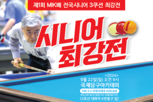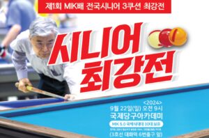 [9월 22일] 50세 이상(1974년생) 시니어 3쿠션대회 열린다…MIK배 제1회 전국 시니어3쿠션 최강전.. 일산 국제당구아카데미에서 열려 2024/ 08/ 11 댓글 없음 Read More »