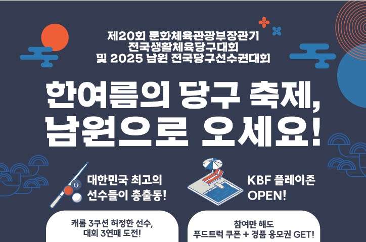 여름맞이 관중 이벤트도 ‘풍성’ 대한당구연맹(회장 서수길)이 오는 7월 12일(토)부터 16일(수)까지 전북특별자치도 남원시 남원스포츠타운체육관에서 ‘제20회 문화체육관광부장관기 전국당구대회 및 2025 남원 전국당구선수권대회’를 개최한다. 이번 대회는 생활체육선수들이 출전하는 문체부장관기와 전문선수들이 겨루는 전국당구선수권을 함께 운영하는 하이브리드형 당구대회로, 생활체육과 전문체육이 한 공간에서 나란히 펼쳐지는 만큼 당구의 다양한 매력을 한자리에서 경험할 수 있는 특별한 무대다. 특히 2023년과 2024년 […]