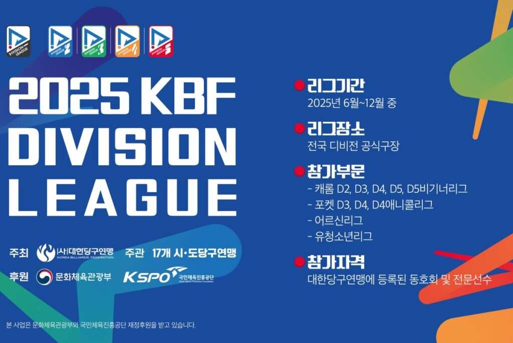 D2~D5까지 4단계 승강제 실시… D1리그 시범 도입 예정 유청소년·어르신 리그 신설, 생애주기형 디비전리그 참여 기반 확대 대한당구연맹(회장 서수길)이 주최하고 전국 17개 시도당구연맹이 주관하며, 문화체육관광부와 국민체육진흥공단이 후원하는 ‘2025 KBF 디비전리그’가 6월 25일부터 본격적으로 막을 올린다. 2025년 디비전리그는 D2~D5의 다단계 리그 체계를 기반으로, 전국 190개 리그, 1,300개 팀, 약 7,000여 명의 선수단이 참여하는 대규모 […]