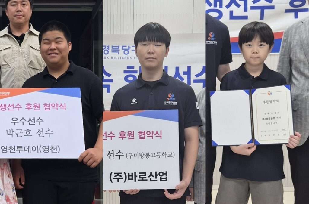 ㈜영천투데이·㈜스마우드아이씨티 등 고1 박근호 ㈜바로산업 고3 김보현-초6 유태승 후원 지역 기업들이 경북당구연맹 소속 학생선수 3인을 후원하며 미래 당구 유망주 육성에 나섰다. 이로써 경북당구연맹은 앞서 이환희·한현우 선수에 이어 소속 학생선수 5명 전원이 후원을 받게 됐다. ㈜영천투데이·㈜스마우드아이씨티는 영천 출신 박근호(구미방통고 1)를, ㈜바로산업은 안동 출신 김보현(구미방통고 3)과 유태승(길주초 6)을 후원한다. 후원식 현장에는 김석호 […]