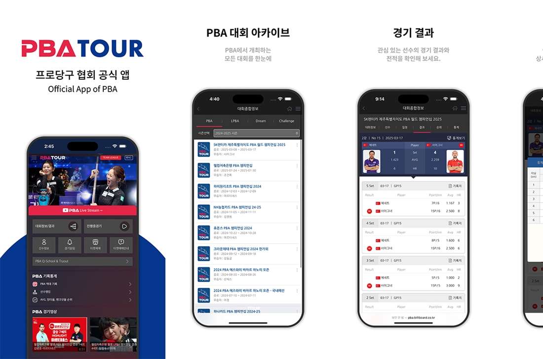 어플리케이션(프로당구협회 PBA)에서도 홈페이지와 같은 기록을 확인할 수 있다. 대회정보 및 결과, 진행중 경기를 비롯해 선수정보, 순위, 경기 알림, 티켓예매, 경기영상 등 다양한 편의성과 안정된 디자인으로 개편됐다.